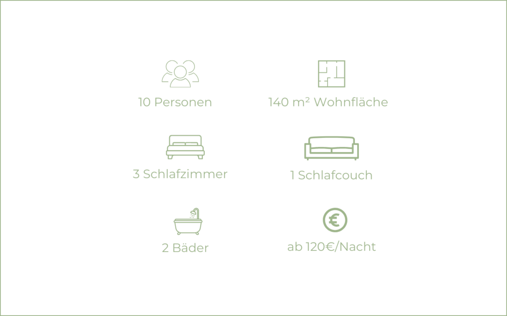 3 Schlafzimmer für bis zu 8 Personen und 2 Kleinkinder (zusätzlich eine komfortable Schlafcouch für 2 Gäste im abtrennbaren Wohnzimmer) sowie 2 Badezimmer sorgen für